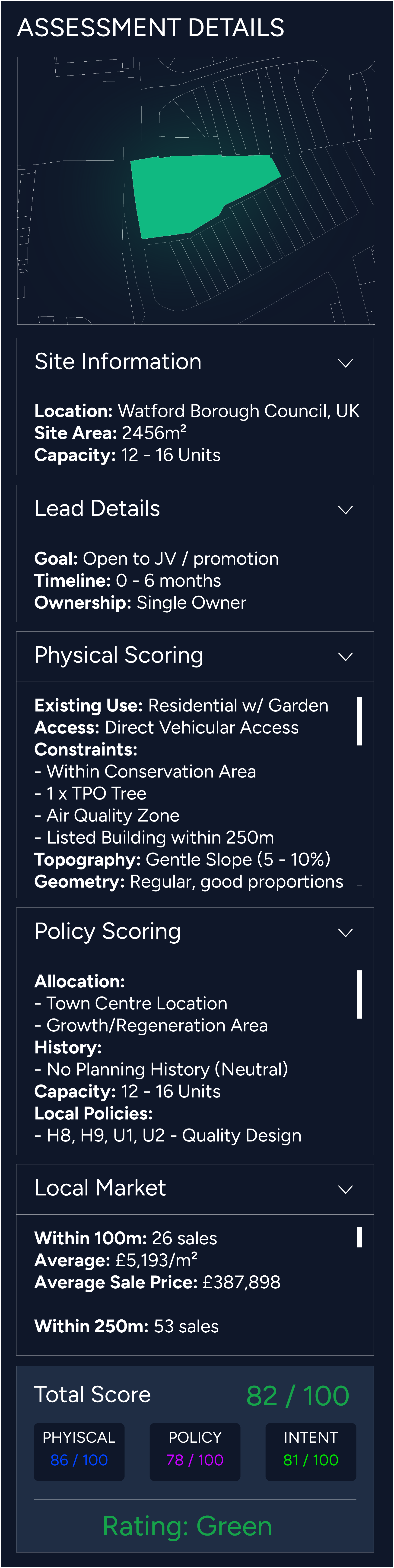 An overall score helps you compare sites and focus attention where there is genuine potential. It supports early judgement, not final decisions.